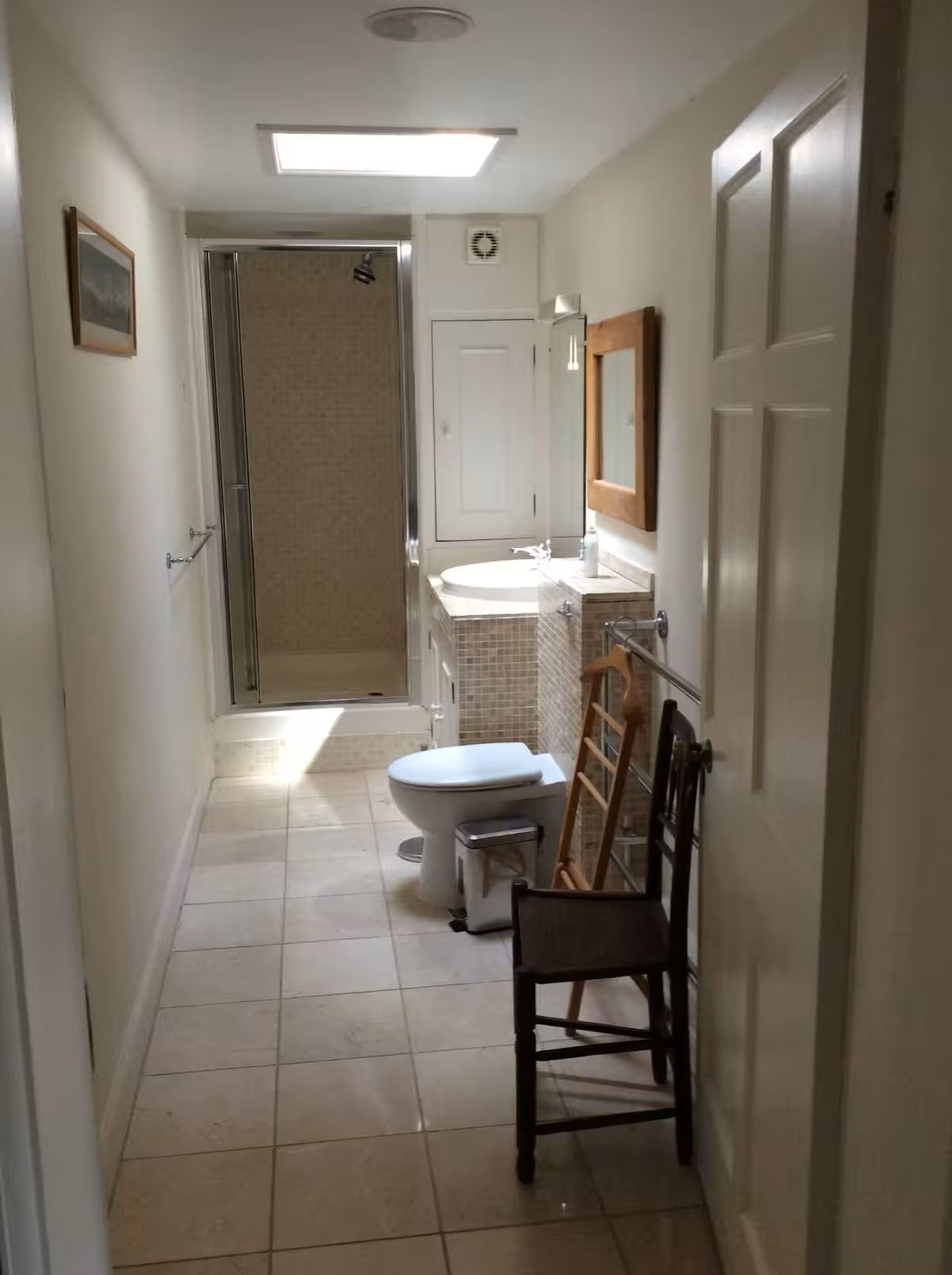 Bathroom has a walk in shower, wc and sink and is situated just across the corridor.